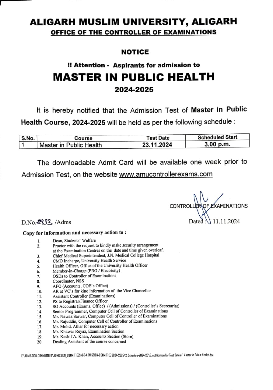 11 Nov, 2024 17:16 PM - Notice regarding Aspirants for admission to Master in Public Health, 2024-25