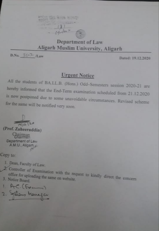 19 Dec, 2020 18:13 PM - Notice regarding postponement of examination for B. A. LL. B on 21.12.2020