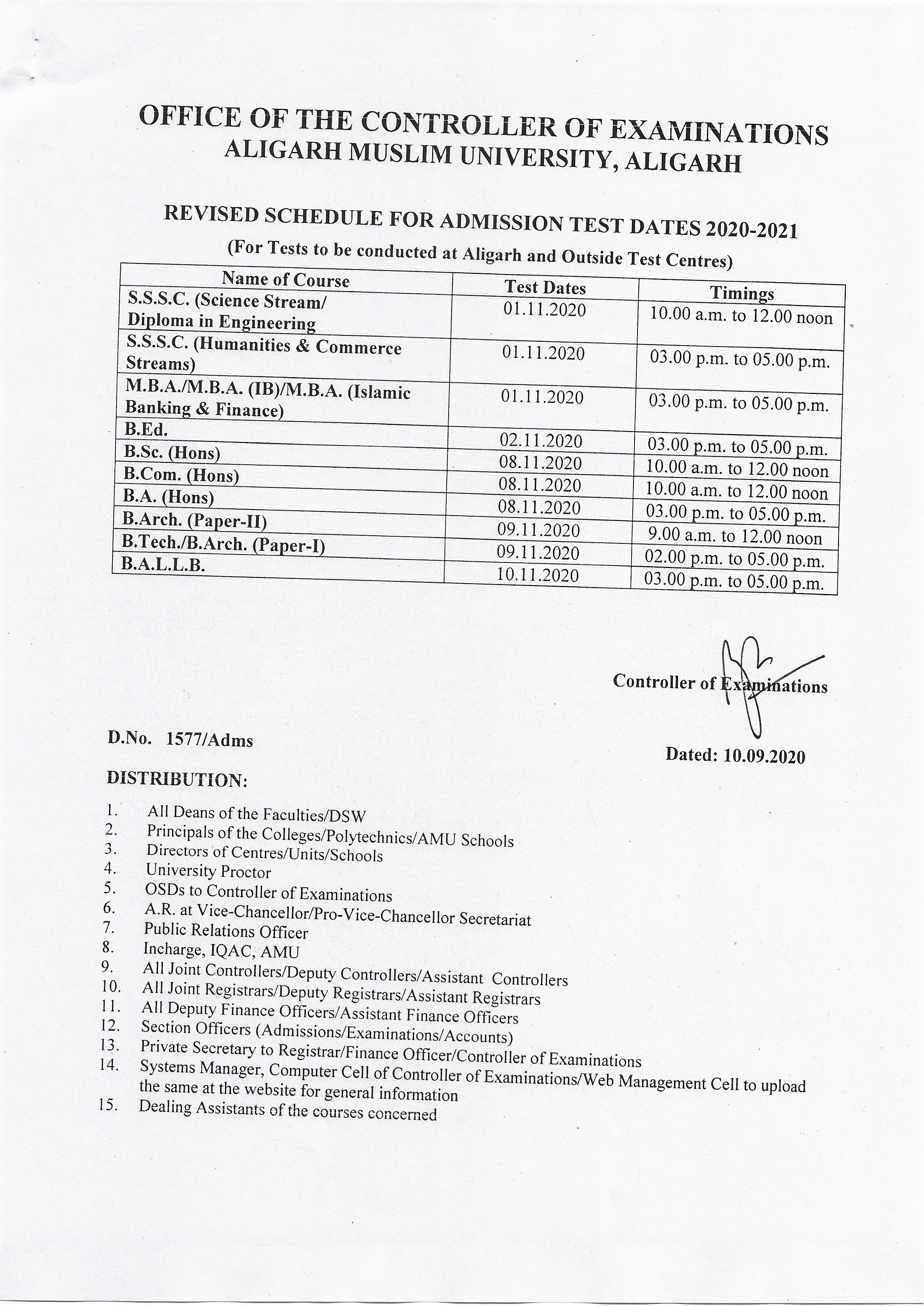 10 Sep, 2020 15:04 PM - Revised Schedule For Admission Test Dates 2020-2021